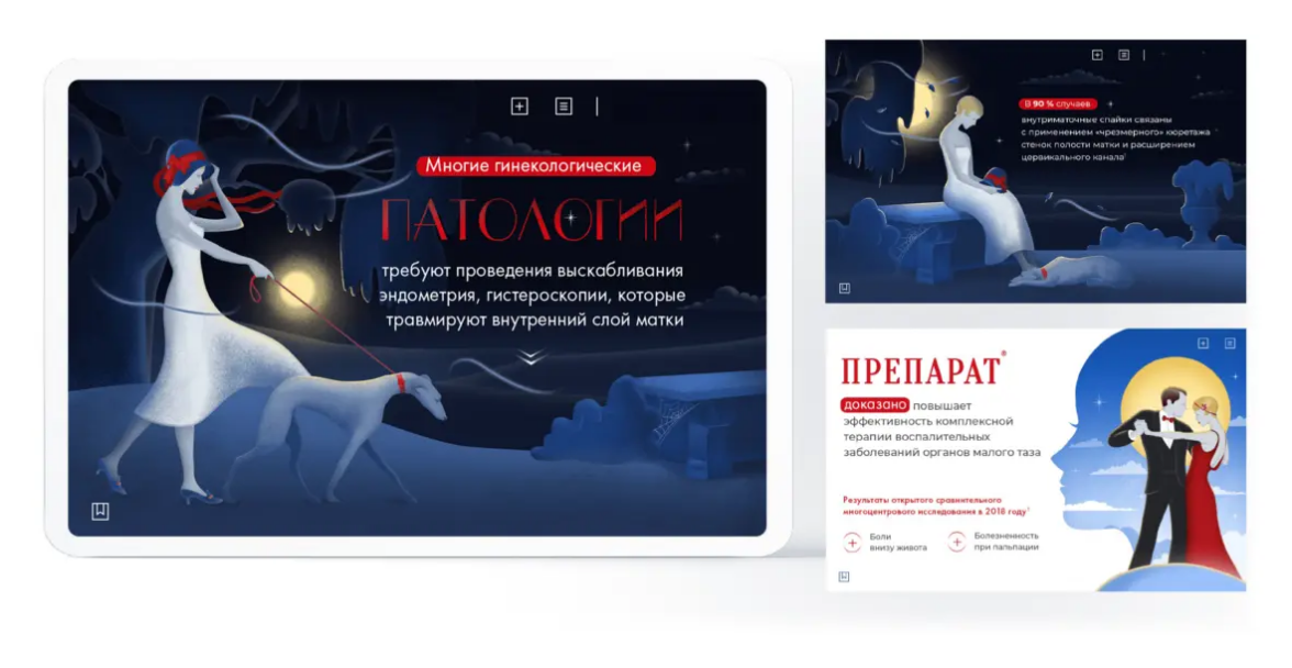 Рассмотрим этот прием на примере материала для врачей-гинекологов. Основная задача — сделать дизайн с информацией о благоприятном воздействии препарата при различных гинекологических заболеваниях. Конкуренты в этой области работают давно, поэтому нам необходимо было качественно выделиться за счет креативной концепции в том числе. Мы создали историю в стиле «Великий Гэтсби», в которой благодаря правильно подобранной врачом терапией вместе с женским здоровьем пациентке удается найти и женское счастье.