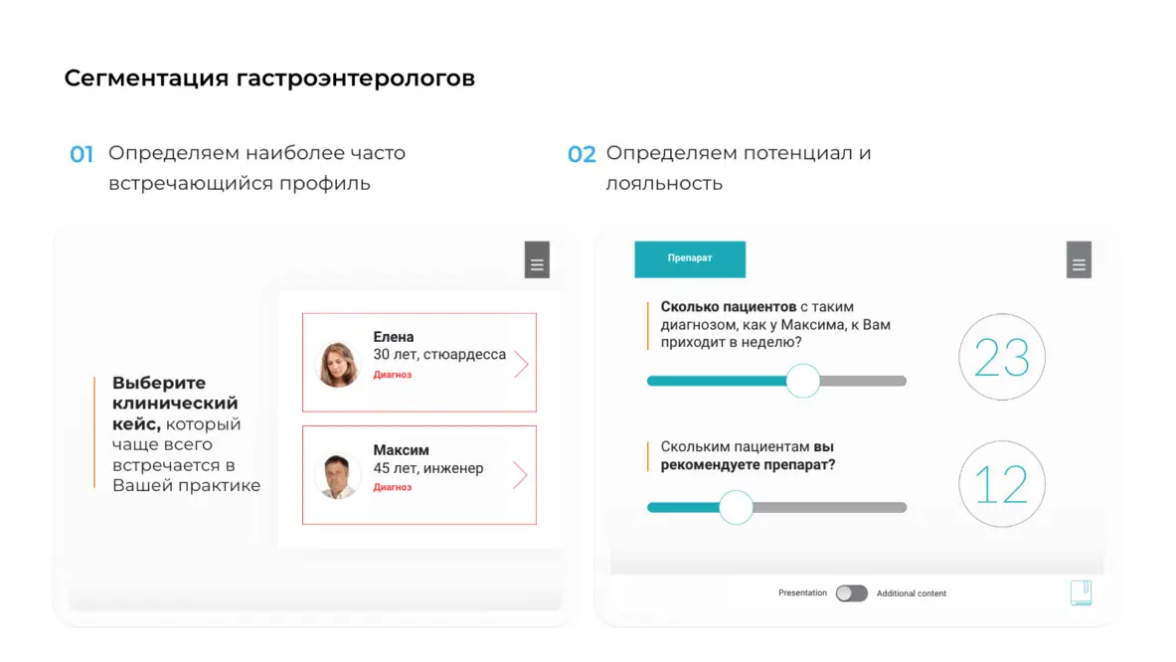 После этого персонализированный сценарий формируется на базе ключевых ответов врача. Он автоматически становится актуальным для конкретного специалиста. Такой подход увеличивает процент визитов с показом презентации и их продолжительность, помогает донести все запланированные маркетингом ключевые сообщения. В результате растет лояльность врачей.