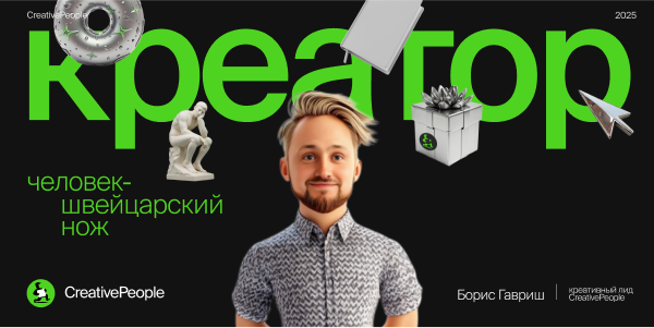 Привет! Меня зовут Боря. Я работаю креатором 12 лет, 4+ из которых — в CreativePeople. Начинал с SMM и креативного копирайтинга, но в процессе чего только не создавал: от SMM до кампаний 360 и креатива для ивентов. Работал с федеральными и международными брендами, номинировался и побеждал на таких фестивалях, как Silver Mercury, WDA и Tagline.