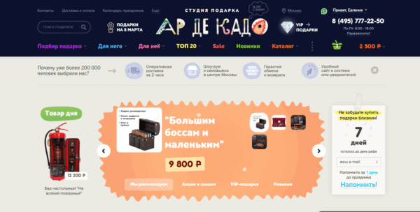 «Ар де Кадо» — интернет-магазин корпоративных и частных подарков. В ассортименте — более 5 000 товаров: от сувениров до премиальных наборов для партнёров. Сайт активно использовался для онлайн-продаж и как рабочий инструмент отдела маркетинга.