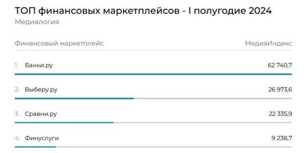 «Выберу.ру» занял вторую строчку в рейтинге финансовых маркетплейсов за первое полугодие 2024 года по версии «Медиалогии», переместившись на одну строчку вверх по сравнению с результатами прошлого года и обогнав показатели ближайшего конкурента в 1,2 раза.