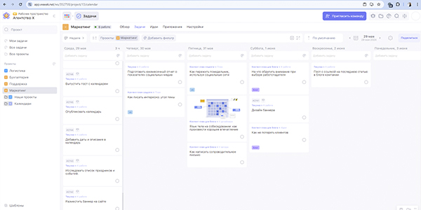 Пять режимов отображения: Канбан-доски, календари на неделю и месяц, списки и диаграмма Ганта