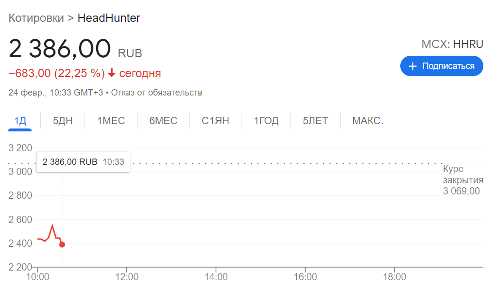 Крупнейший российский джоб-борд (место для поиска работы и размещения вакансий) упал на 22% после начала активных боевых действий. Цена акции на момент открытия сегодняшних торгов достигла минимальных значений за последние полгода — 2386 руб. за бумагу.