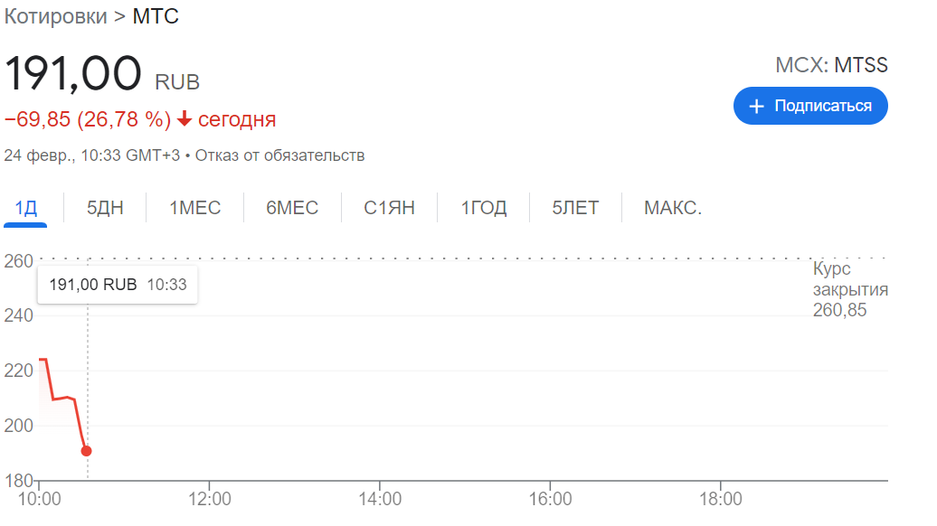 МТС на момент начала торгов обвалился на 26%. Цена акции сейчас — 191 рубль. За неделю экосистема потеряла более трети стоимости, падение составило 33%.