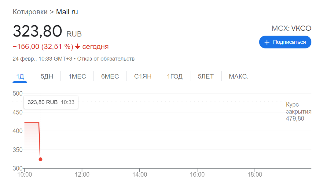 За день акции VK на Мосбирже упали на треть. Сейчас цена одной акции — 323 рубля. С начала недели акции подешевели на 45%.