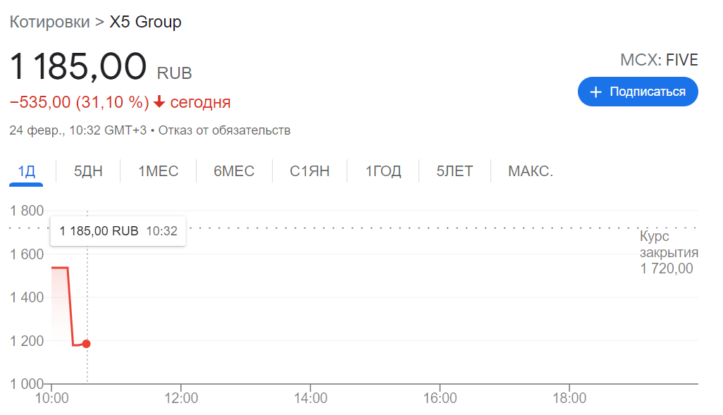 Акции X5 Group за утро упали на 31%. Ценная бумага группы теперь стоит 1185 руб.