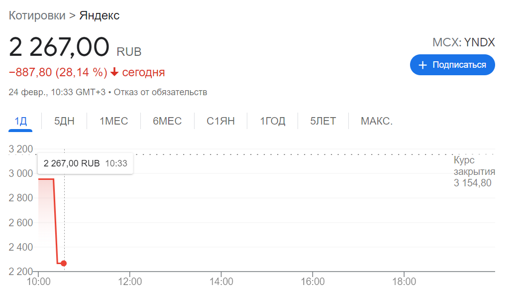 Сегодня акции «Яндекса» открылись на уровне 2267 руб. за бумагу, что на 28% дешевле, чем вчера. Потери за неделю составили более 40%.