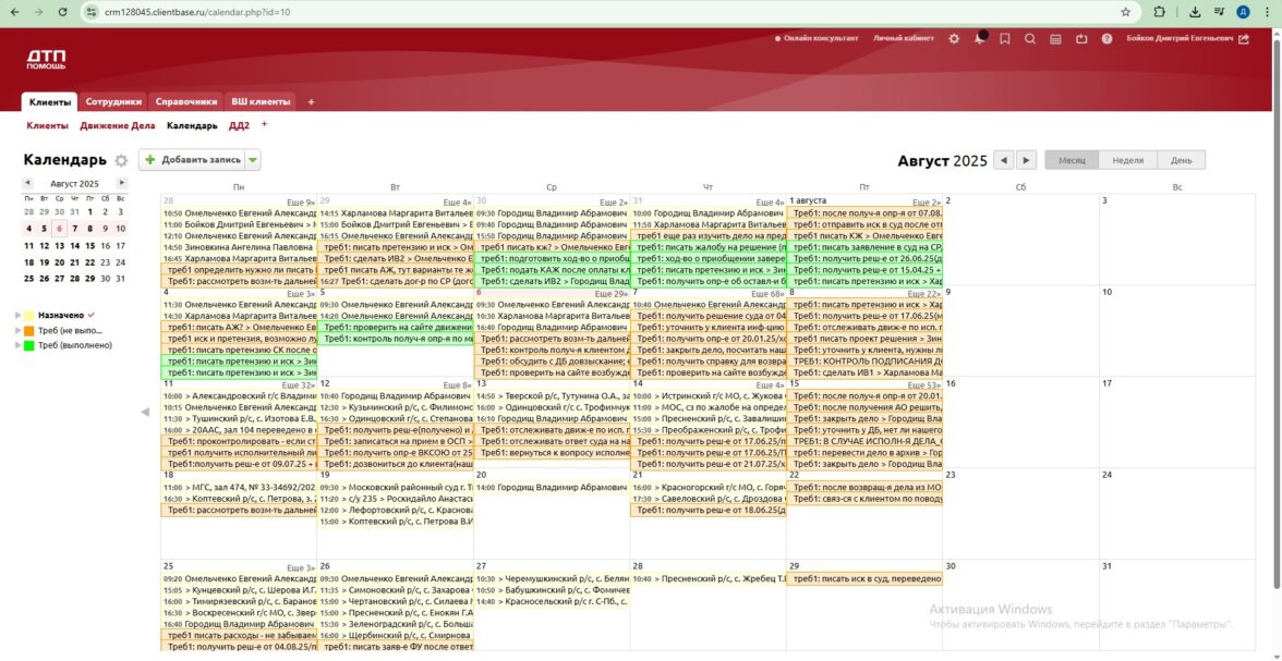 Специальный календарь интегрирован с карточками дел и позволяет: