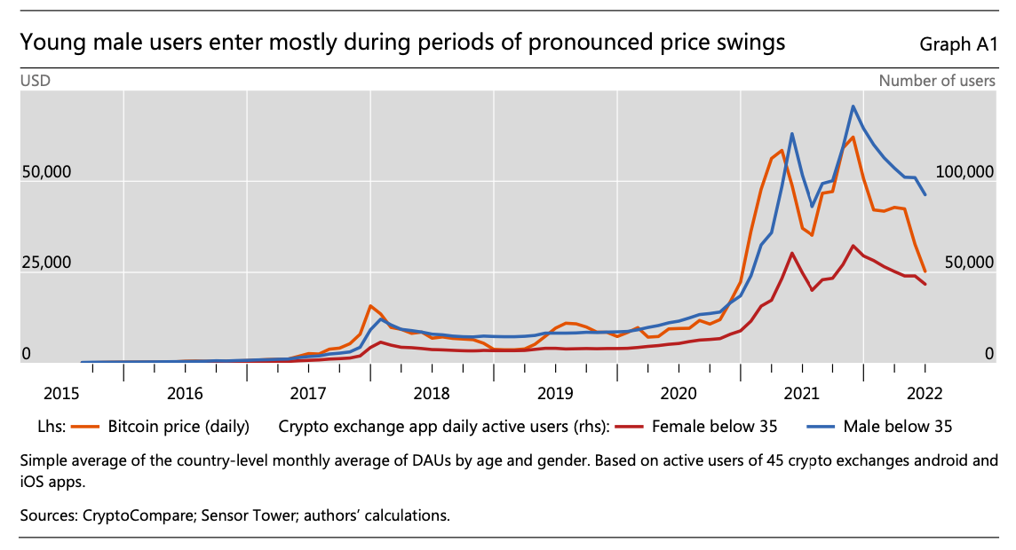 Молодые мужчины гораздо более чувствительны к ценам на биткоины, чем пожилые мужчины или женщины любого возраста.