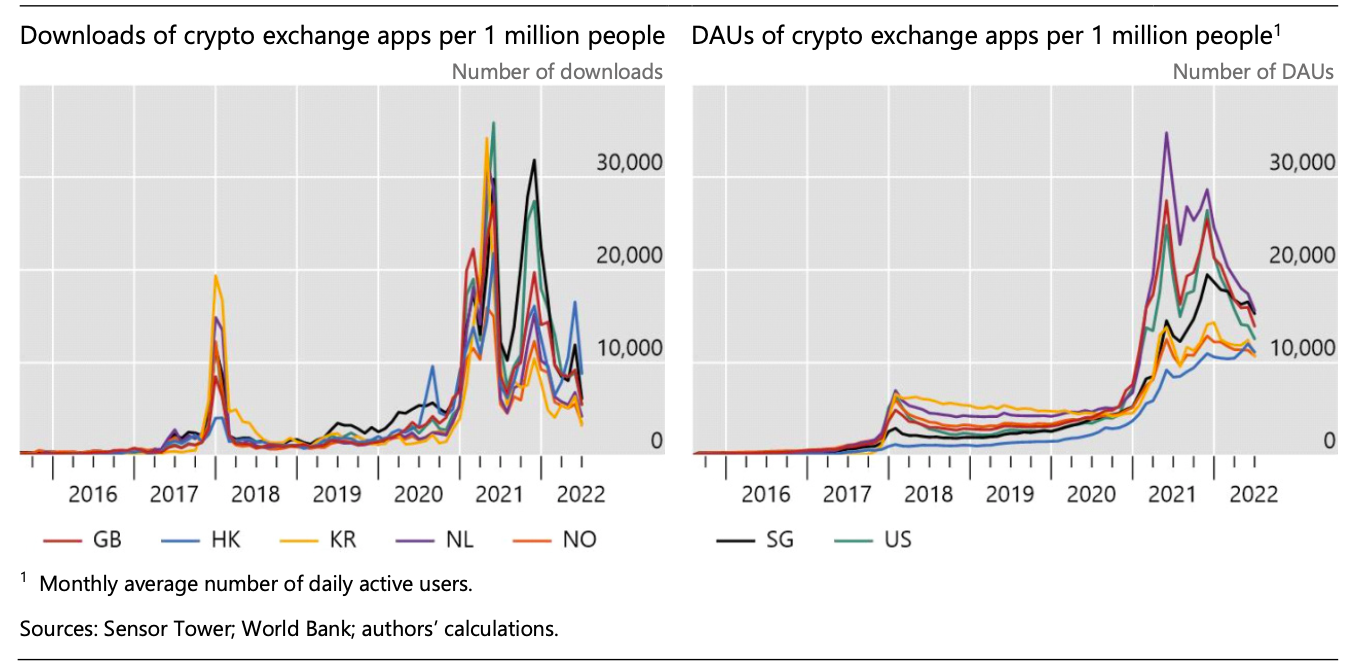 Чтобы исследовать модели криптотрейдинга, исследователи BIS создали базу данных об использовании розничными инвесторами приложений обмена в 95 странах с данными за период с августа 2015 года по декабрь 2022 года. Рассматривались более 200 популярных приложений криптообмена. В основе исследования — данные аналитической платформы Sensor Tower, которая постоянно мониторит приложения, в том числе собирает различную статистику по загрузкам и активному использованию приложений из Apple Store и Google Play. Исследователи учитывали данные об операционной системе загружающего криптоприложение устройства Apple iOS и Android — первая говорит о более высоком уровне доходов владельца смартфона. А также сведения о поле и возрасте пользователя.