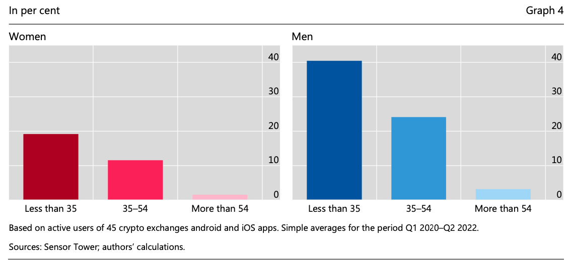 На сегодня самую большую группу криптовалютчиков — почти 40% — составляют мужчины в возрасте до 35 лет. Эту группу характеризует повышенная склонность к риску. Мужчины в возрасте от 35 до 54 лет значительно осторожнее — их 25%. Менее 35% всех криптовладельцев в мире составляют женщины, а большинство женщин-пользователей криптоприложений моложе 35 лет.