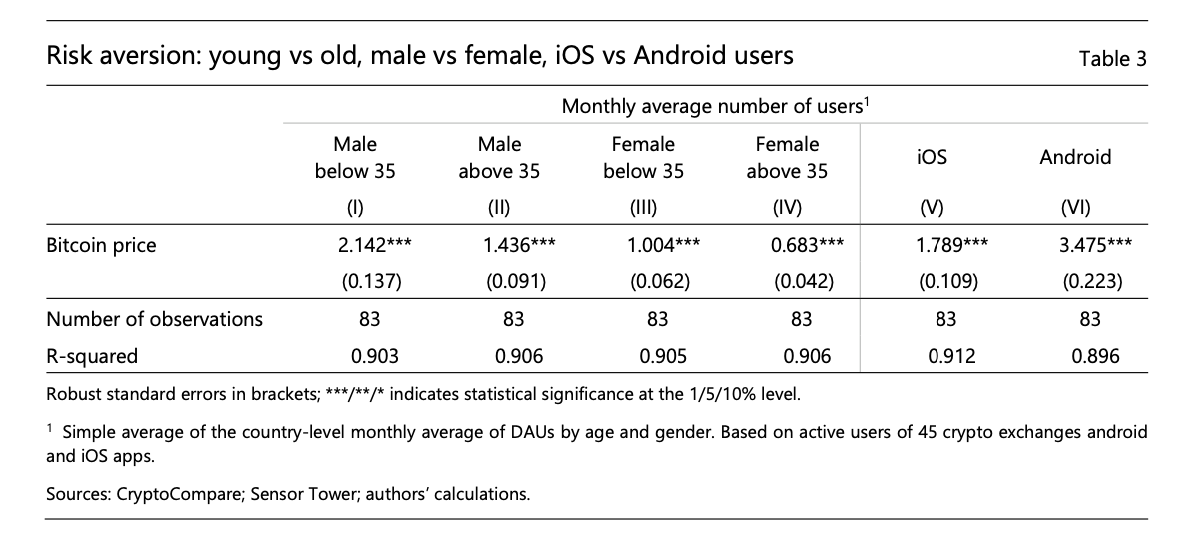 Исследователи нащупали связь между маркой смартфона и склонностью к криптоигре. Они оговариваются, что у них нет информации о доходах пользователей-криптоинвесторов, но они знают, какой операционной системой те пользуются. Владельцы техники на Android, как правило, имеют доход ниже, чем владеющие устройствами на Apple iOS. Чувствительность к повышению цены среди пользователей с устройством Android примерно в два раза выше, чем у пользователей с устройством iOS (столбцы 5 и 6 в таблице выше). То есть люди с низким доходом с большей вероятностью начнут использовать приложения для криптобиржи после повышения цен.