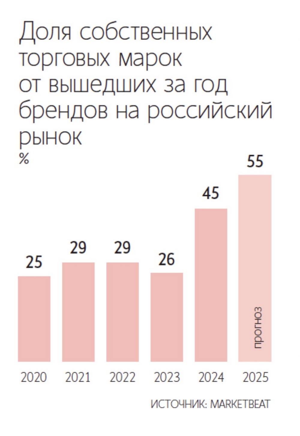 Собственные торговые марки (СТМ) в сегменте непродовольственного ритейла — одежда, обувь, товары для дома и прочие категории — имеют потенциал занять в 2025 году до 55% рынка, если реализации всех заявленных планов удастся добиться, пишут «Ведомости» со ссылкой на отчет консалтинговой фирмы Commonwealth Partnership (CMWP). В исследовании отмечается, что ранее, в 2024-м году, эта цифра составляла лишь 45%, а в период с 2019-го по 2023-й показатель колебался и не превышал и четверти (до 24%).