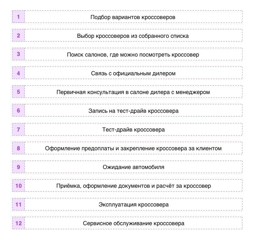 Воронка начинается с подбора вариантов кроссоверов и заканчивается сервисным обслуживанием уже купленного автомобиля. Именно так клиент «идет» к покупке автомобиля. Воронку всегда можно расширить или, наоборот, исключить некоторые пункты.