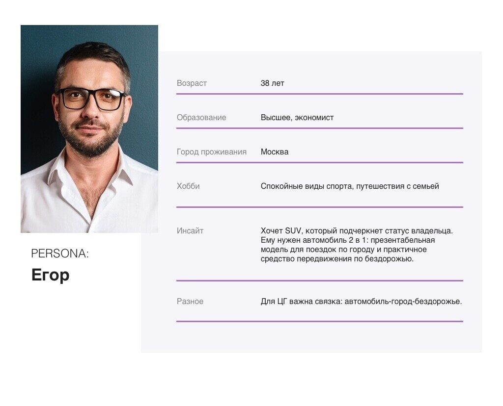 Общая целевая аудитория автомобильного бренда ― те, кто водят машину. Условно, мы выделили 5-6 ключевых групп. Одна из очевидных целевых групп, на которую может быть направлена коммуникация автомобильного бренда, ― семейные мужчины 30+ с доходом от 100 тыс. рублей в месяц.