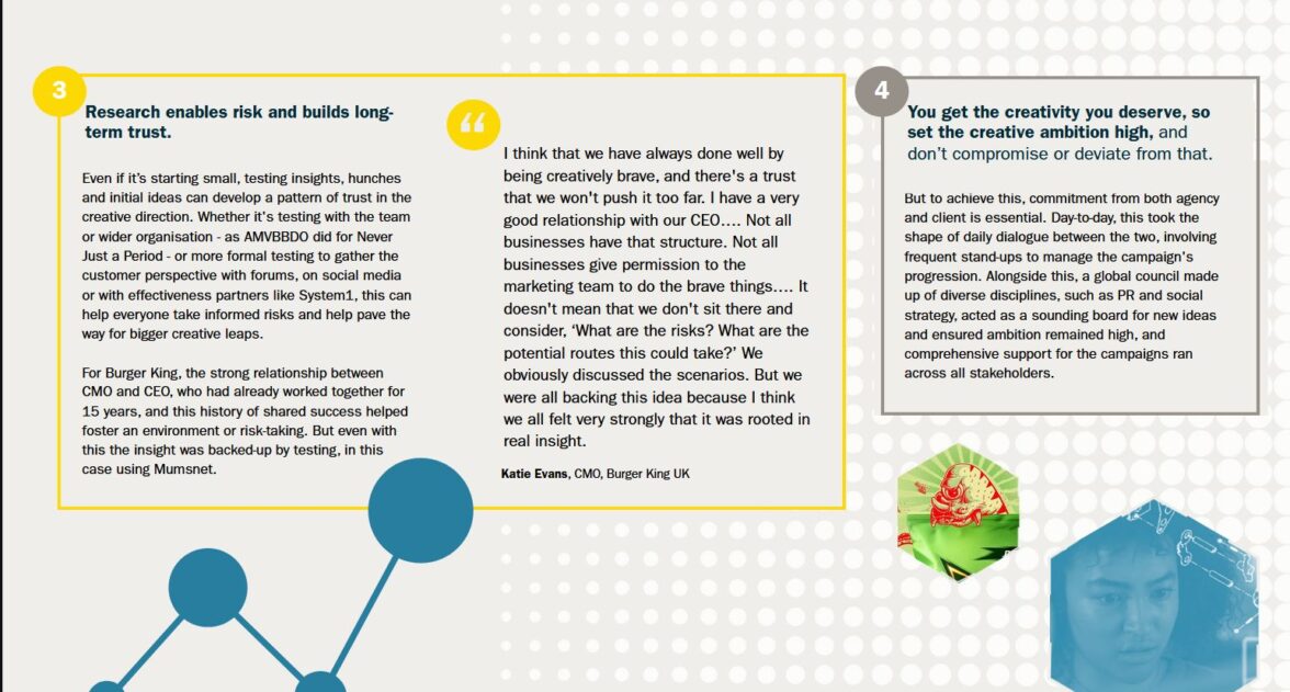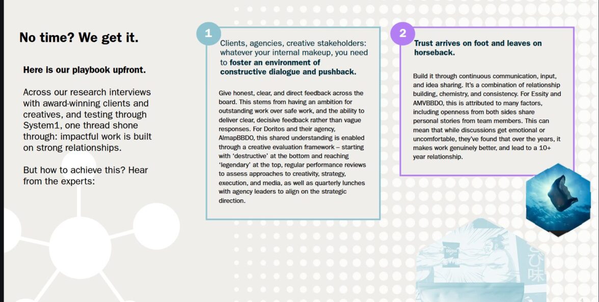 Исследование показало, что если яркий креатив не приносит результатов, виноваты не копирайтеры и арт-директоры, а качество их отношений с бренд-менеджерами. По результатам интервью с участниками процесса, лучшие результаты достигаются, когда у команд есть общие амбиции и они понимают, к чему стремятся; между ними налажен диалог со здоровым конфликтом идей; они доверяют друг другу и не боятся предлагать смелые идеи и, наконец, ориентированы на долгосрочные результаты, а не на краткосрочные метрики или скорость выполнения KPI.