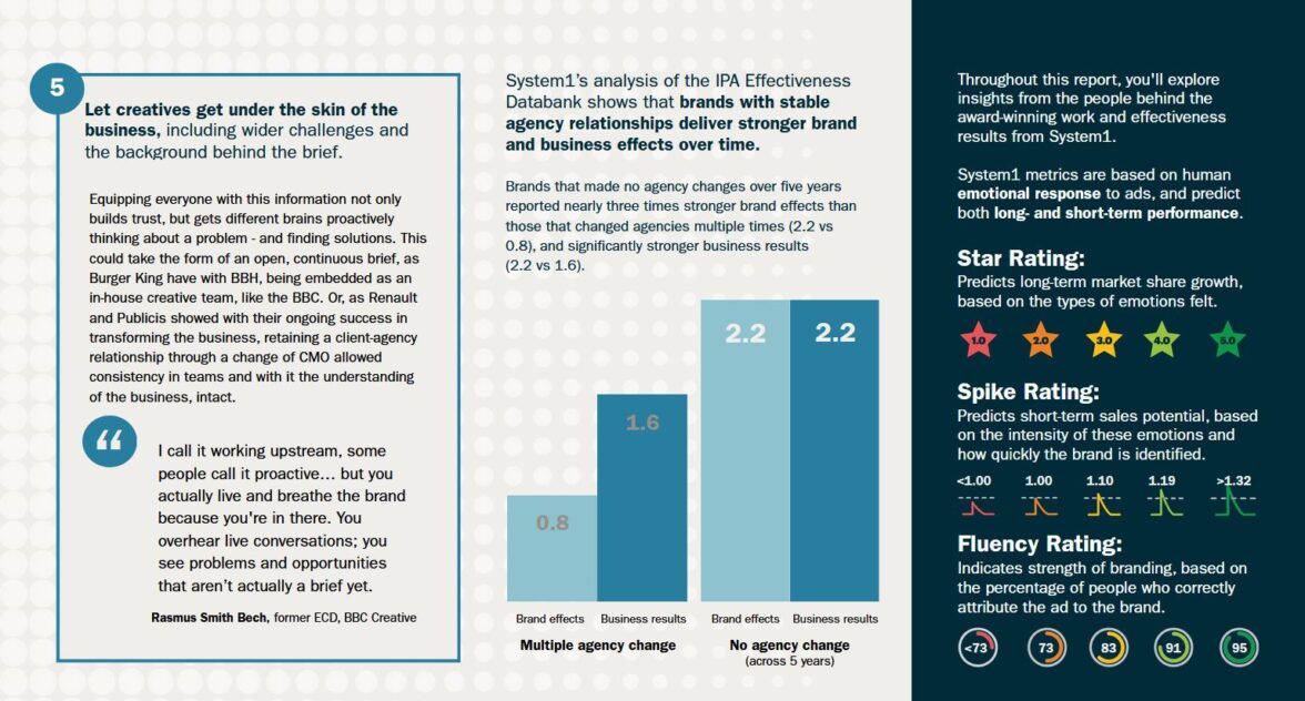 «Вместо того чтобы менять агентство, увеличивать бюджеты на рекламу или искать новые идеи, сначала нужно понять, что не так в отношениях с текущим агентством — оценить уровень доверия, прозрачности и долгосрочной оценки стратегий у обеих команд. Часто проблема не в таланте креаторов и их идеях, а в условиях, которые созданы для их развития», — утверждают аналитики D&AD и System1.