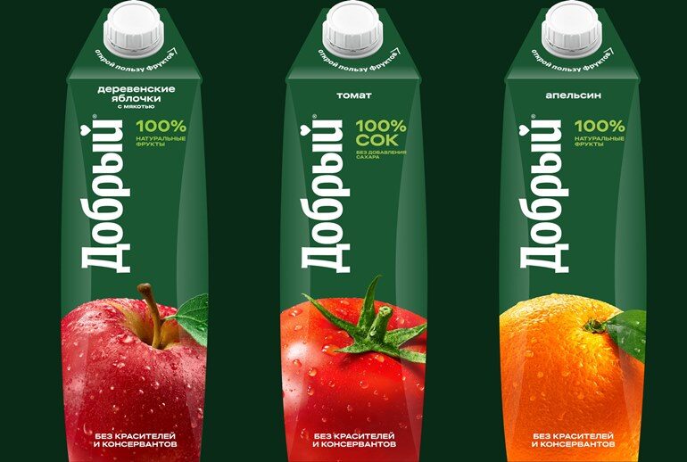 Студия Артемия Лебедева разработала новый дизайн литровых упаковок соков «Добрый»: логотип на стандартной пачке теперь ставят вертикально, в центре — гиперреалистичная композиция из фруктов и ягод, а блоки преимуществ построены вокруг числовых показателей (проценты, объёмы, содержимое). Цвета остались в рамке существующей палитры бренда, но макет стал проще: меньше декоративных элементов, больше чистых плоскостей и читаемой иерархии.