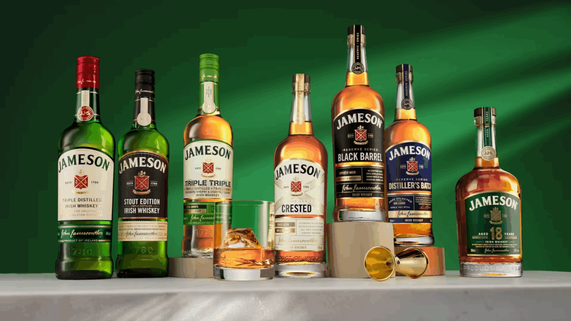 Jameson провёл точечный редизайн: освежил логотип, герб, цветовую палитру, добавил иллюстрацию бутылки и выровнял визуальные решения по всей продуктовой линейке. Проект реализовало агентство JDO, специализирующееся на брендинге и упаковке для глобальных FMCG-компаний (Pernod Ricard, PepsiCo, Unilever, Shell).