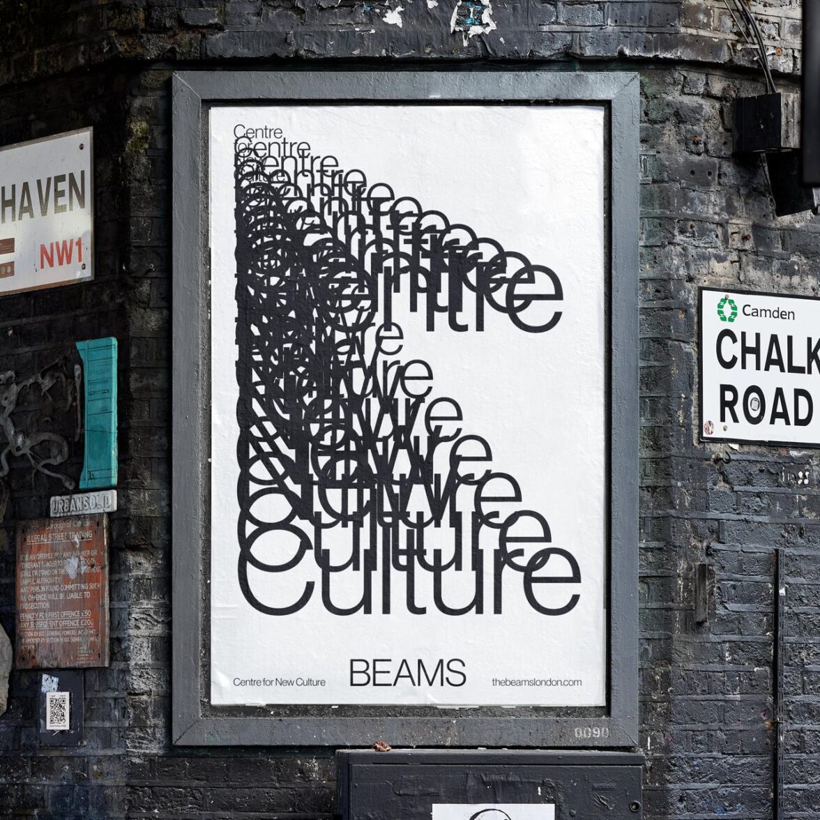 The Beams от Only. Не самый свежий проект и, возможно, недостаточно необычный, но когда я увидела его в мае 2023, он произвёл большое впечатление. Бренд, который плевать хотел на разборчивость, на лёгкость чтения. Многократное тиражирование названия, заголовка, символа. Айдентика балансирует, меняя количество повторов, отрабатывает пространства макета. Живая штукенция!
