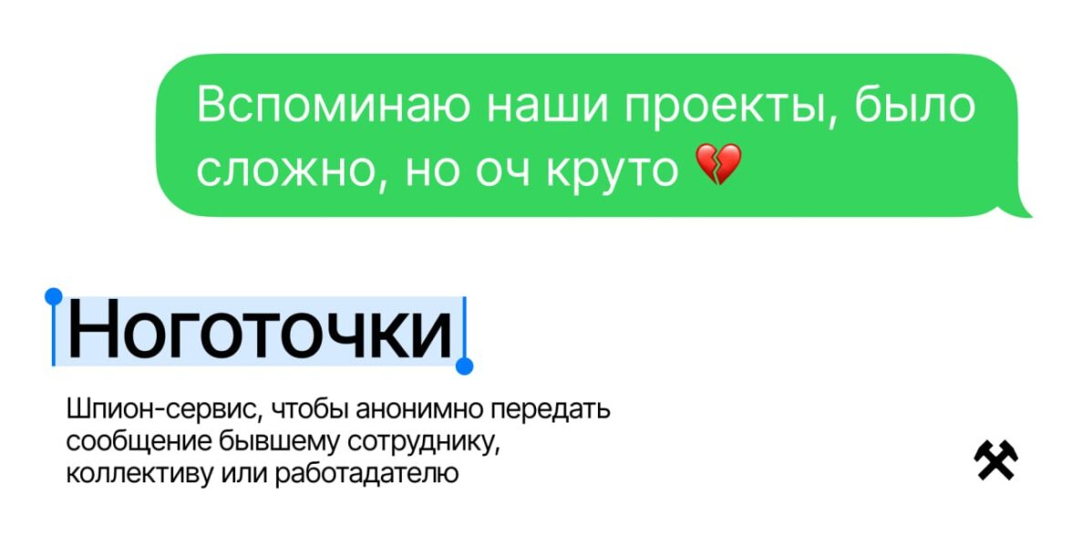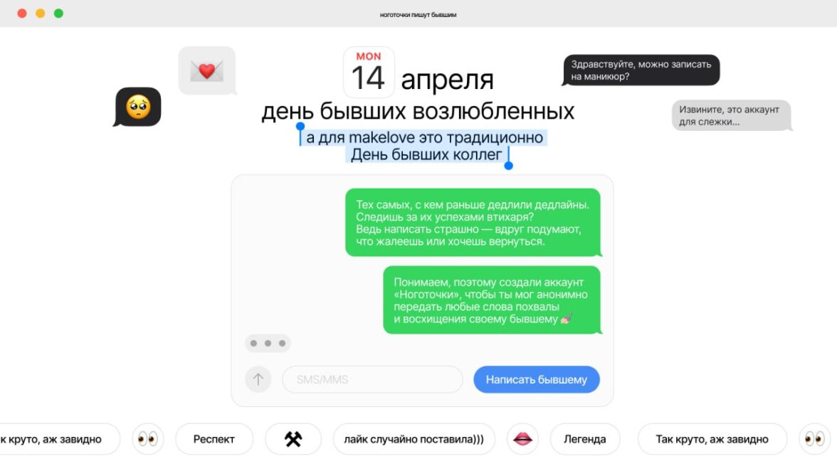 Написали бывшим.Несколько лет назад мы заметили, что в офисе остаются вещи бывших коллег: кто-то забыл забрать свою любимую кружку или оставил кеды. Тогда два наших креативных директора начали думать над спецпроектом про тех, кто уже не работает в компании (в то время еще было популярно продавать вещи бывших на авито). В итоге в makelove был основан новый день — день бывших коллег, и каждый год 14 апреля (хотя это день бывших возлюбленных), мы празднуем день бывших коллег и очень любим этот праздник. В этом году, например, мы связывали бывших через фейковый аккаунт Ноготочки. Любой желающий мог написать сообщение своему бывшему коллеге/руководителю, чтобы поблагодарить его или просто сказать «я скучаю». Мы анонимно доставлял весточки нужным контактам. Это создало настоящий инфоповод в HR-сообществе: многие каналы писали про проект, но самое важное — то, что нам удалось напомнить, как важно поддерживать связь с бывшими сотрудниками (а вдруг вернутся), а еще многие теперь вместе с нами празднуют день бывших 14 апреля). Проект мы сделали целиком внутри агентства. Бюджет в размере 700 рублей ушёл на симку и Telegram Premium. В результате получили 50 000 охвата, 10% из них — органически.