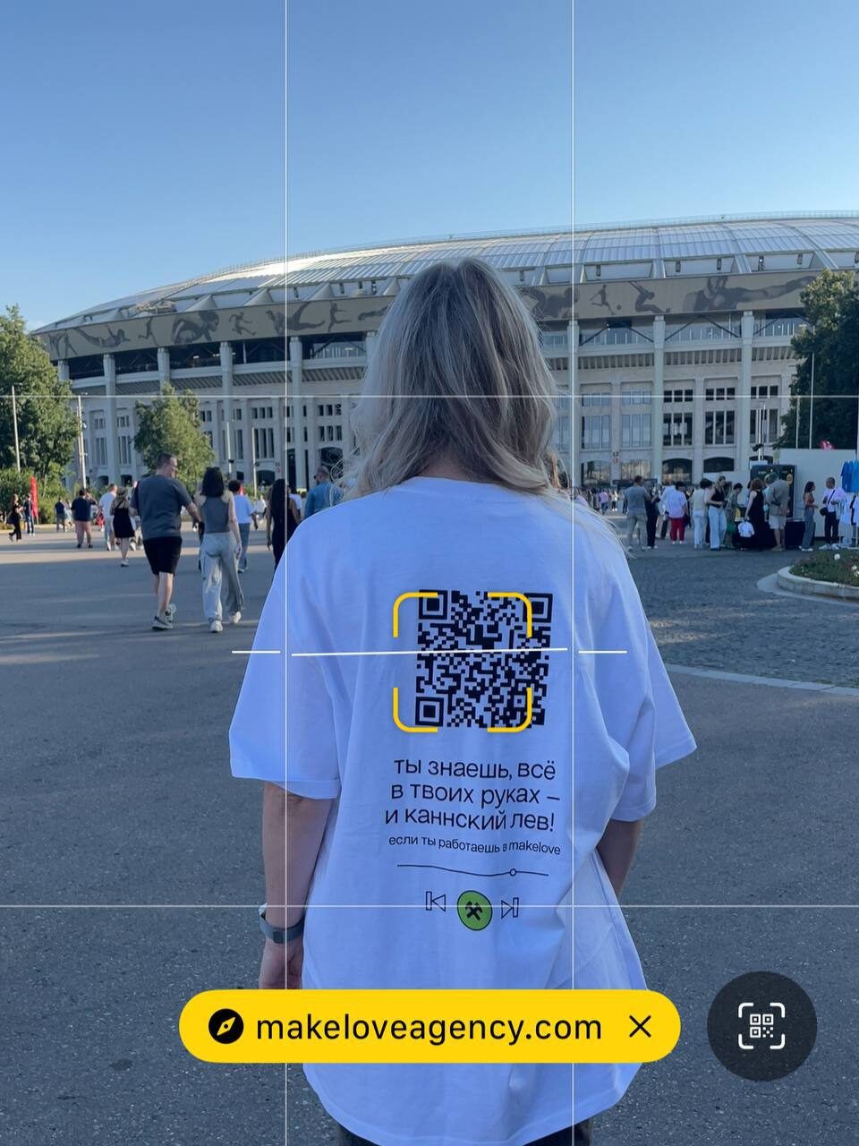 Пошли с коллегами на концерт Агутина.И сделали из этого настоящий спецпроект: придумали слоганы, отражающие работу в makelove и пересобрали их на лад песен музыканта. Так получились легендарные фразы: «Ты знаешь, всё в твоих руках — и каннский лев! Если ты работаешь в makelove» «Хоп-хей ла-ла-лей, где вопросы, где ответы? Всё в агентстве makelove» и другие. Фразы с QR-кодом, ведущим на карьерный сайт, были на наших футболках. В результате охватили 70 000 человек аудитории, получили +300 подписчиков в запрещенной соцсети и просто повеселились)