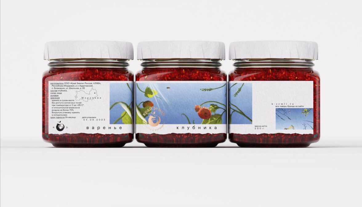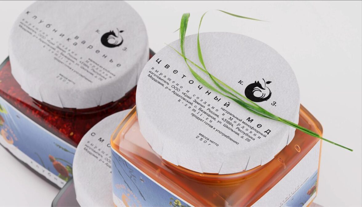 Студия Omsky — мои королевы чудачеств. Тут даже сложно говорить про один проект, но я остановлюсь на семейном бренде «Край земли». Кое-где мне даже сложно проследить систему, на которой базируется типографика. Но главное — это ощущение лёгкости: буквы, как маленькие пчёлки (основной продукт мёд), летают по макетам. Дух свободы в каждой упаковке, чистота, воздух, но не минимализм! Это так хорошо, что можно прослезиться.