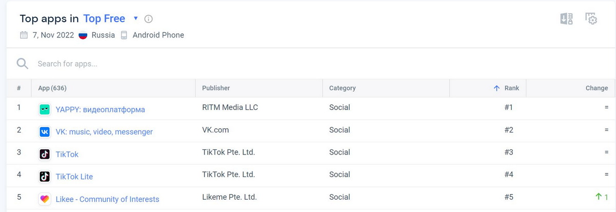 По данным Similarweb приложение Yappy занимает первое место в рейтинге приложений социальных платформ в России, обогнав даже «ВКонтакте».