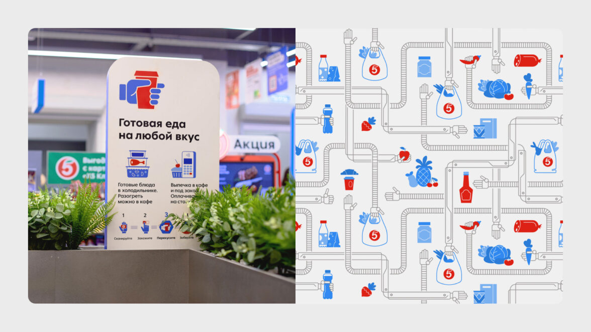Студия Артемия Лебедева разработала айдентику для нового формата магазинов «Пятёрочка», которые теперь соседствуют с дарксторами — складами для сборки заказов. В основе нового стиля — голубая молния, символизирующая скорость и удобство. Она присутствует во внешнем оформлении, навигации и интерьере, придавая пространству динамику. Дополнительные графические элементы — изображения роботизированных рук, схемы и визуальные подсказки — отражают автоматизацию и скрытые процессы, делая механику покупок наглядной и понятной.