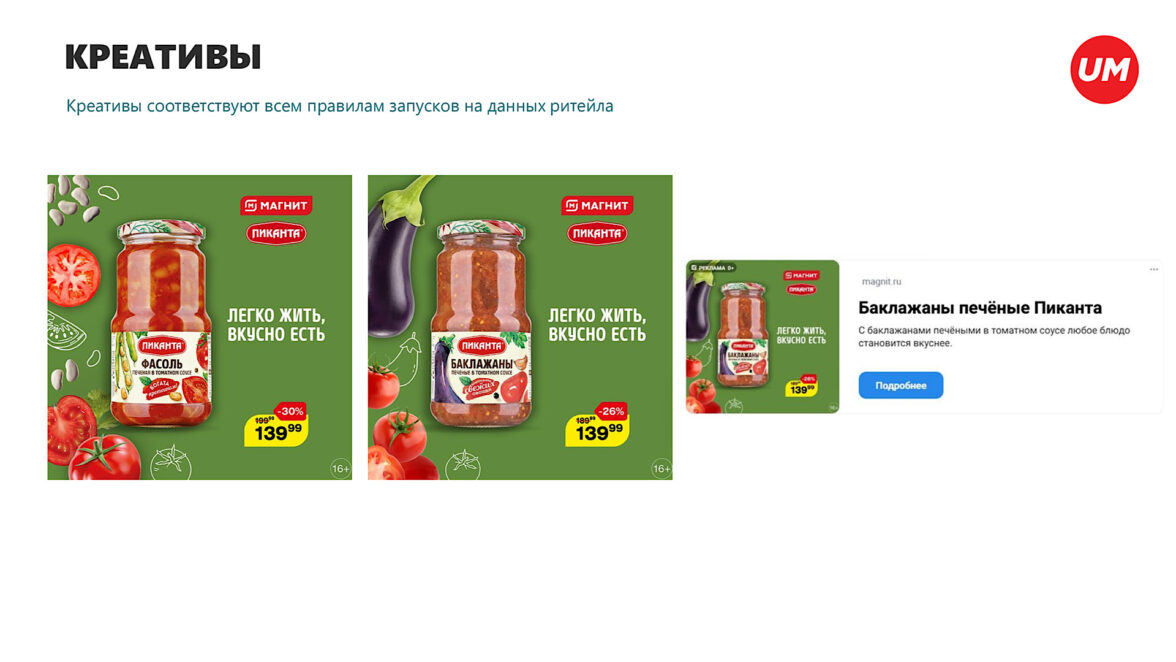 Основой кампании стали first-party данные «Магнита» — глубоко сегментированные профили потребителей на базе DMP-платформы. На данных «Магнит» были сформированы поведенческие сегменты на основе чеков покупателей, объединённых по ID, историей покупок, регулярностью, сезонностью и чувствительностью к промо. Эти данные позволяют точечно таргетировать пользователей, минимизируя медийные потери. Медийная стратегия строилась на простоте: баннерные размещения с акцентом на визуал продукта, промо-цену и понятный призыв к действию. Форматы — web-баннеры, ведущие на страницу товара в «Магните». Креативы были разработаны клиентом с учётом узнаваемости SKU и минимального визуального шума — основной задачей было обеспечить моментальное считывание предложения.