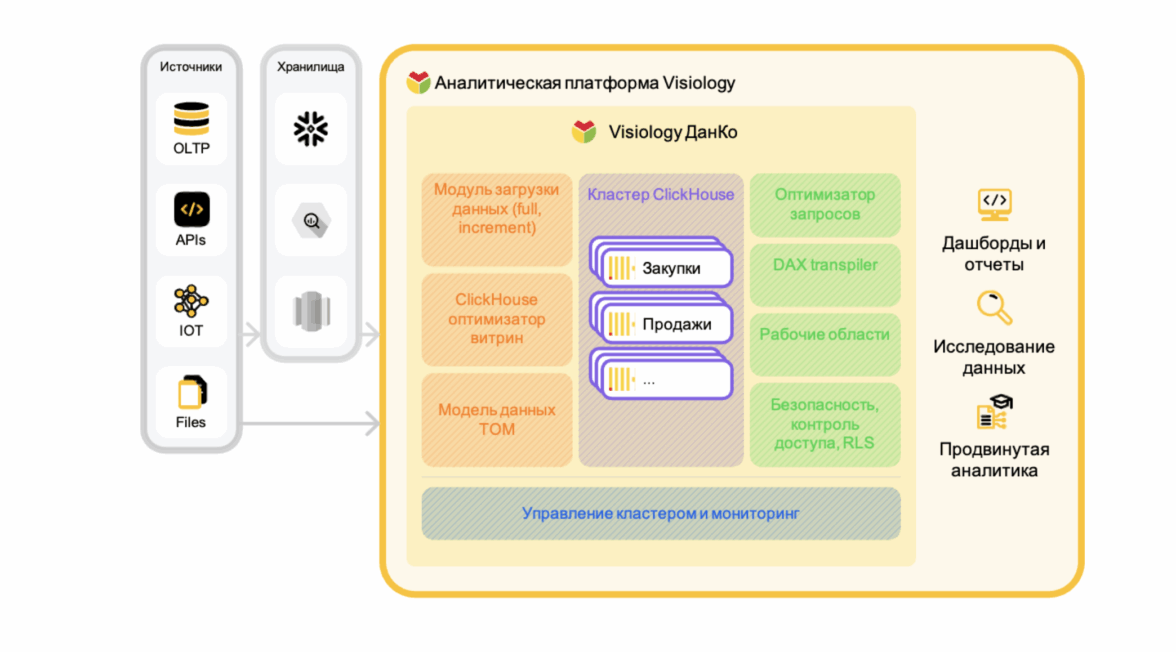 BI-платформа с ИИ-функциями поддерживает сложную аналитику, визуализацию, создание дашбордов и отчетов. Аналитический движок «ДанКо» автоматизирует процессы, обеспечивая разделение доступа, быструю и эффективную обработку данных, постоянную загрузку из источников и доступность аналитики в различных форматах.