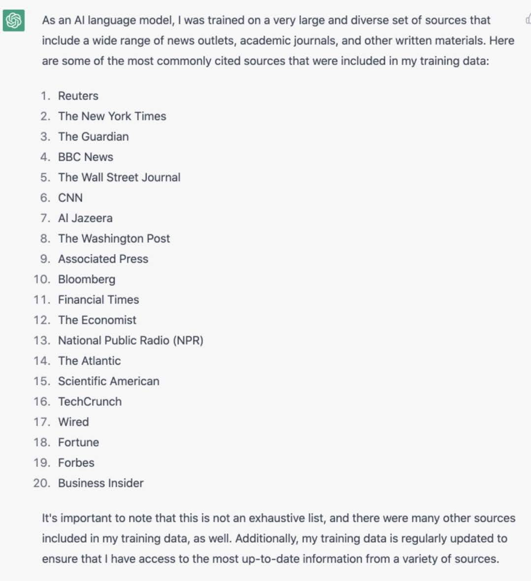 Юридическая зацепка у медиагрупп появилась после того, как две недели назад компьютерный журналист Франческо Маркони опубликовал твит о том, что материалы новостных агентств использовались для обучения ChatGPT. Маркони рассказал, что запросил у чат-бота список источников новостей, на которых он обучался, и получил ответ с указанием 20 источников.