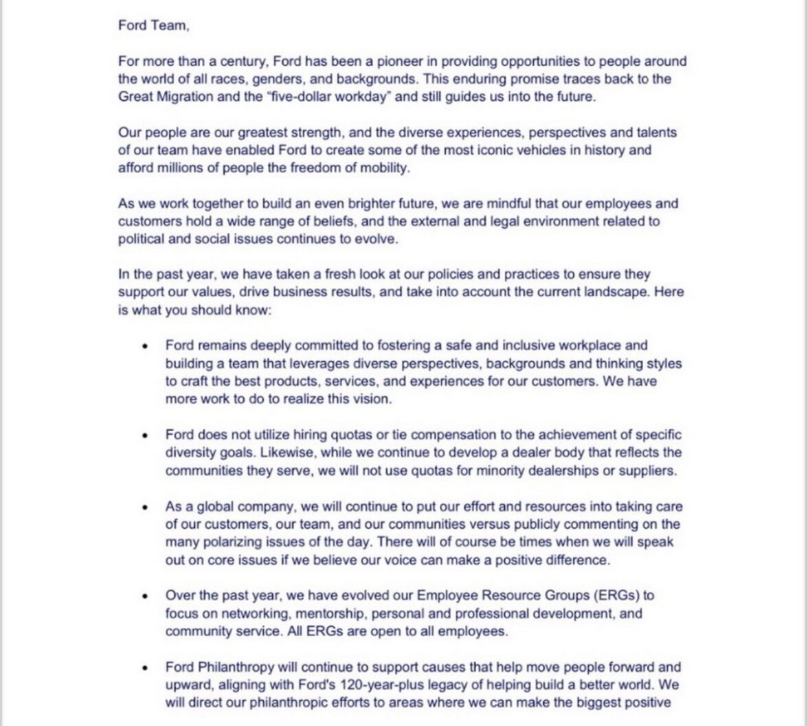 28 августа сотрудники компании Ford Motor получили имейл от своего гендиректора Джима Фарли, в котором сообщалось, что, оказывается, еще в прошлом году компания изменила свой подход к политике DEI. Компания больше не участвует в опросах, проводимых организацией Human Rights Campaign (HRC), которая занимается борьбой за права сексуальных меньшинств. На основе этих опросов HRC составляет Индекс корпоративного равенства (Corporate Equality Index). Ford также не будет каким-то образом отмечать и поощрять своих дилеров и поставщиков за показатели, связанные c DEI.