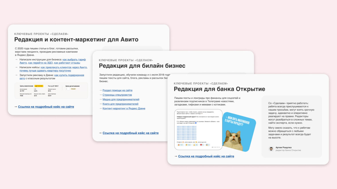 А если важно показать комплексность услуг, из этих кейсов можно собрать мегакейс. Мы так делаем со своими самыми крупными и долгими проектами: собираем кейсы по ним на одной странице и при необходимости показываем потенциальным клиентам.