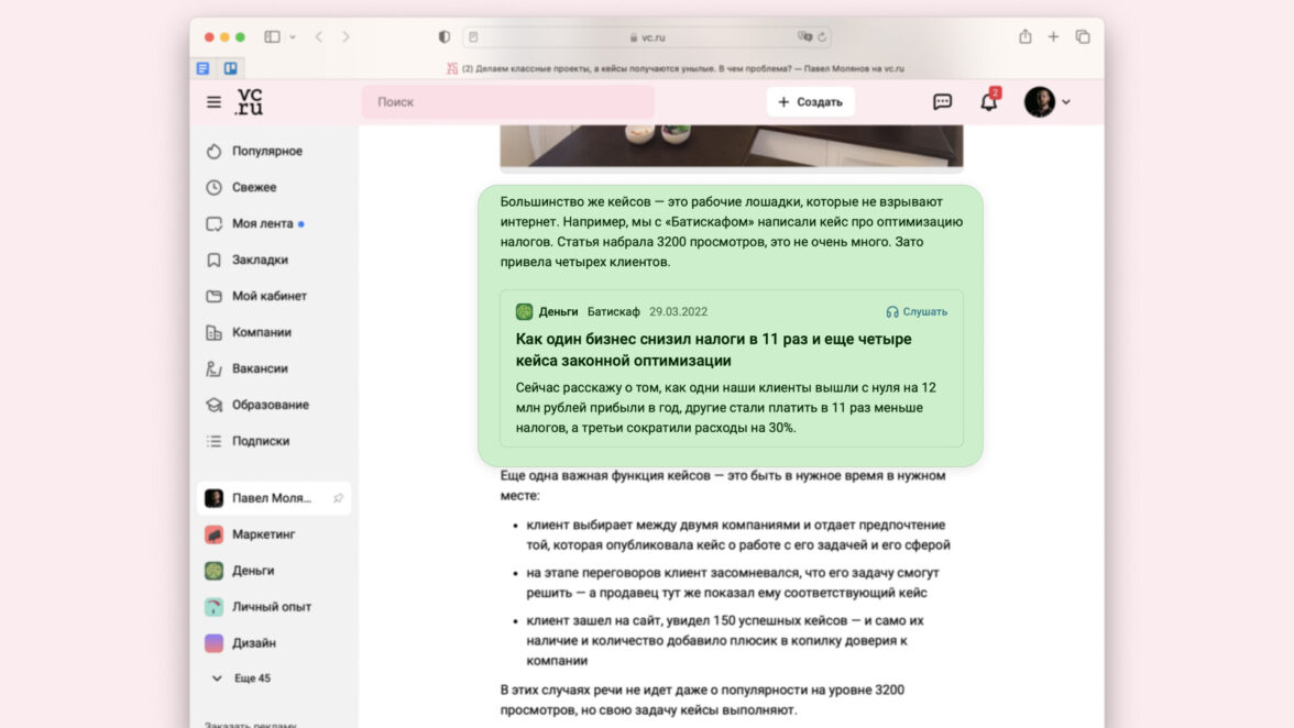 Большинство же кейсов — это рабочие лошадки, которые не взрывают интернет. Например, мы с «Батискафом» написали кейс про оптимизацию налогов. Статья набрала 3200 просмотров, это не очень много. Зато привела четырех клиентов.