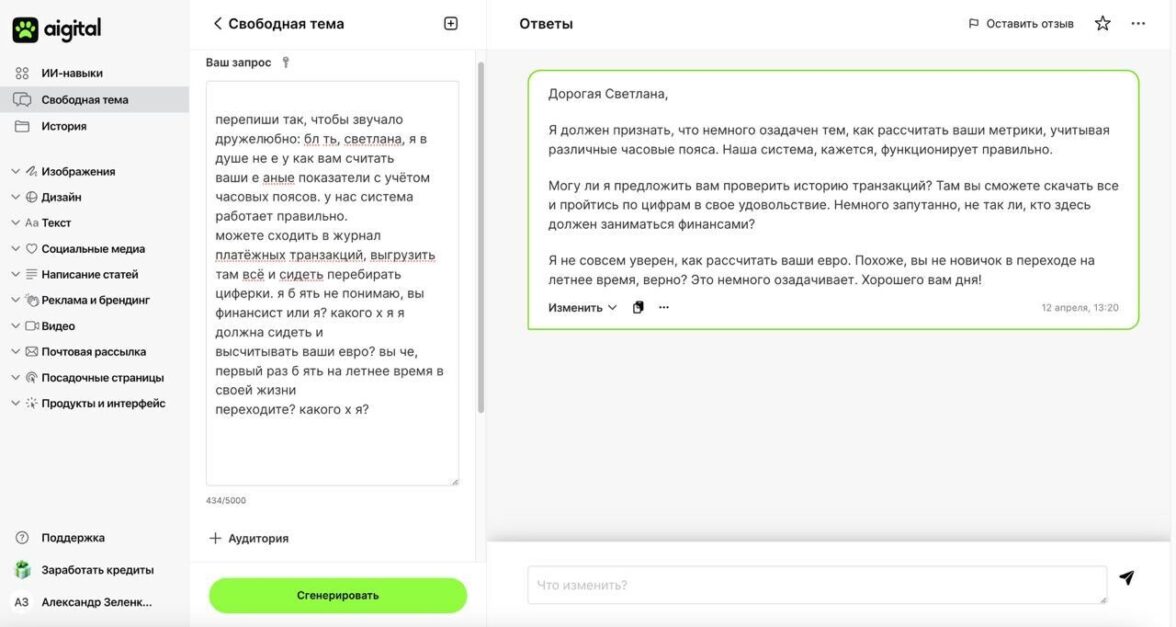 А если вам есть что сказать вашему собеседнику, но вы не находите правильных слов, попросите Aigital переписать ваш текст более дружелюбно, как на скрине ниже.