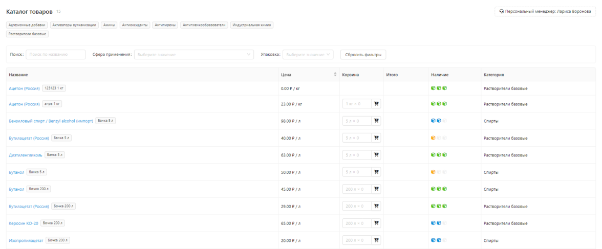 В категориях есть функция настройки сферы применения продукции. Например, базовые растворители используют в качестве сырья для производства индустриальных лакокрасочных материалов. Пользователь будет видеть сферы применения в каталоге, это поможет определить, какой именно продукт нужно заказать.