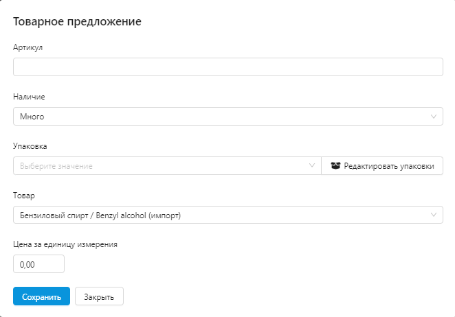 У товаров можно настраивать наличие, вид упаковки, объёмы фасовки и сразу посмотреть, как информация будет выглядеть в карточке товара.
