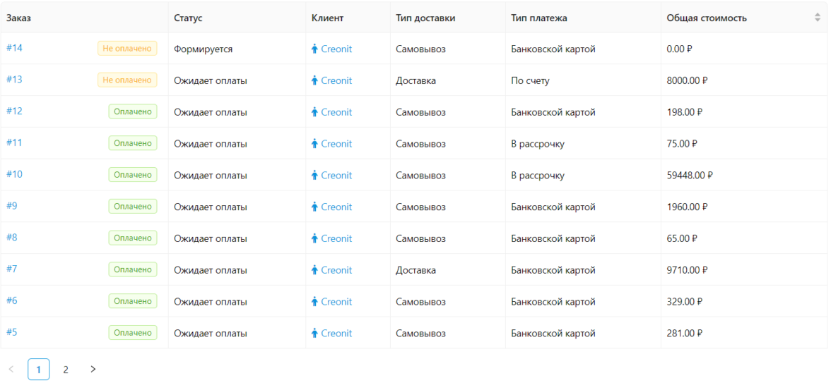 Высвечивается номер заказа, статус оплаты, клиент, тип доставки и платежа, а также общая стоимость.