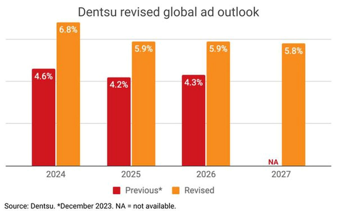 Японский Dentsu, входящий в «большую пятерку» международных рекламно-коммуникационных холдингов, опубликовал во вторник свой ежегодный прогноз расходов на рекламу, заметно улучшив ожидания роста как для США, так и для мирового рынка до 2027 года. Согласно новым оценкам компании, в 2024 году глобальные расходы на рекламу увеличатся на 6,8% — это на 2,2 процентных пункта больше, чем в предыдущем прогнозе, выпущенном в декабре 2023 года. Тогда эксперты рекламного гиганта ожидали годового роста 4,6%.
