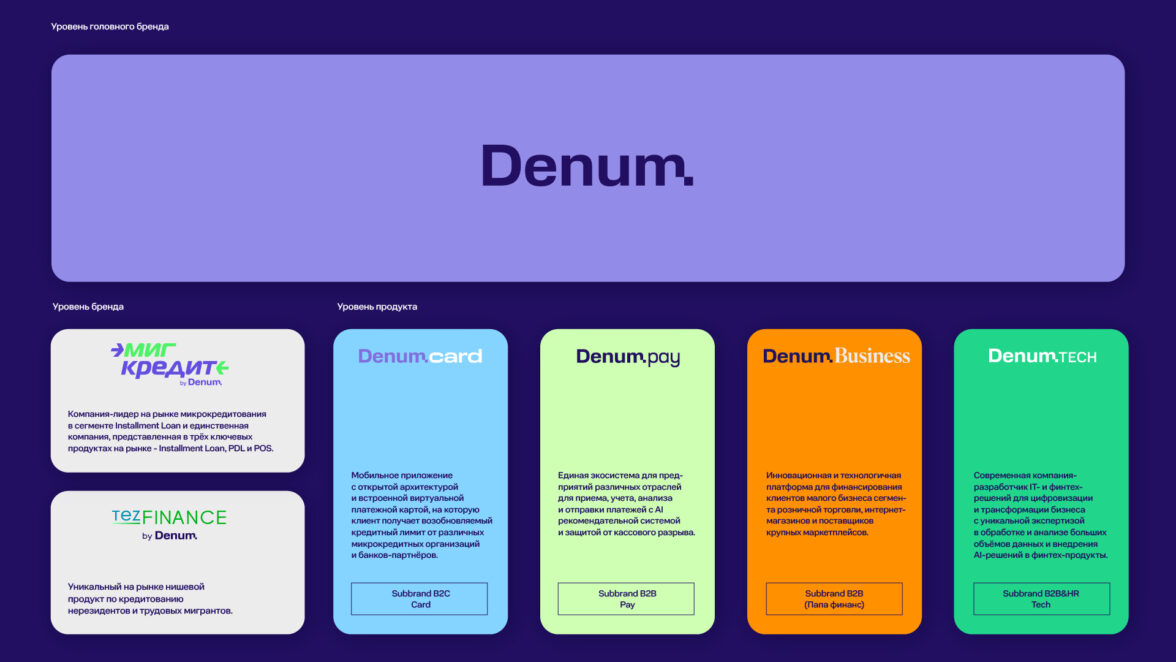 Выбранная зонтичная архитектура предполагает, что корпоративный бренд Denum ориентируется на работу с B2B, а продукты выпускаются как суббренды Denum Tech (компания-разработчик IT- и финтех- решений для цифровизации и трансформации бизнеса), Denum Business (технологичная платформа для финансирования клиентов малого бизнеса), Denum Pay (единая экосистема для предприятий для приёма, учёта, анализа и отправки платежей) и Denum Сard (мобильное приложение со встроенной виртуальной платёжной картой). Смыслы и принципы бренда передаются «сверху-вниз» — от компании к самим продуктам.