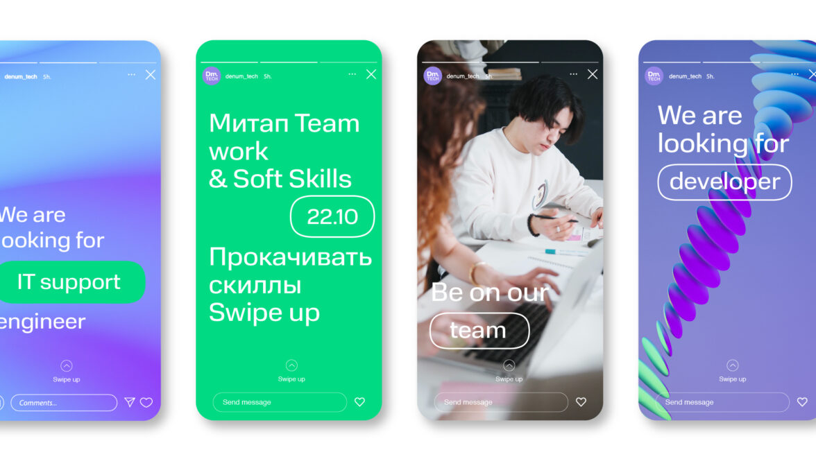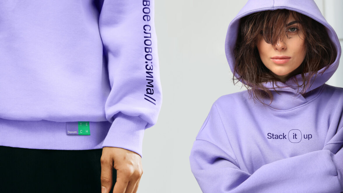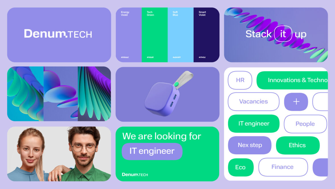 Идея выбранной клиентом концепции раскрывается в слогане, который отражает ценности и атрибуты бренда — Stack it up (с англ. «складывать деньги стопками»). В палитре присутствуют светлый фиолетовый и зеленый цвета. Первый отсылает нас к головному бренду и его позиционированию, а зеленый — подчеркивает важность экологичных и комфортных отношений в команде. Созданный нами паттерн также отражает ключевую идею компании.