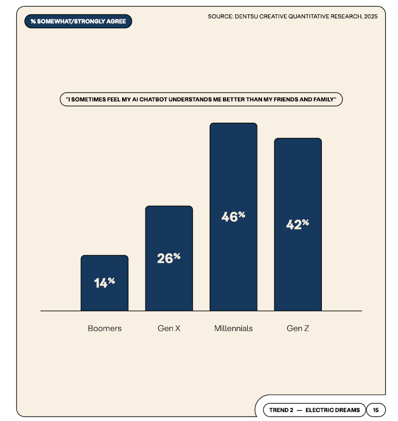 Доля согласных с утверждением «Мне иногда кажется, что мой чат-бот понимает меня лучше, чем друзьям и семья» среди представителей разных поколений. Слева направо: бумеры (1946–1964), поколение Х (1965–1980), миллениалы (1981–1996), зумеры (1997–2012).