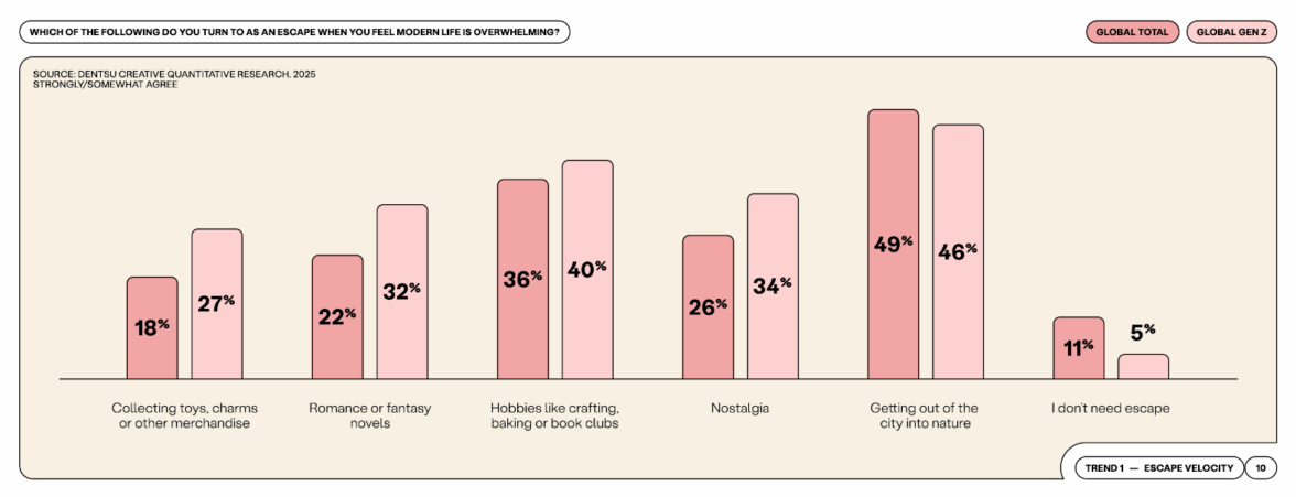 Доля утвердительных ответов на вопрос «К чему из перечисленного вы обращаетесь, чтобы убежать от перегружающей вас современной жизни?» Темно-розовый — доля ответов всех респондентов, светло-розовый — ответы зумеров (1997–2012 годы рождения). Слева направо: коллекционирую игрушки, амулеты и другие мелочи; читаю книги — романтические и фэнтези; занимаюсь хобби — поделки, кулинария, книжные клубы; ностальгирую; выбираюсь из города на природу; мне не нужно убегать.