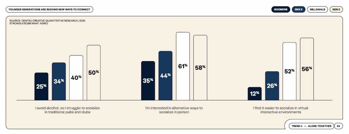 Доля согласившихся со следующими утверждениями в зависимости от поколения. Утверждения (слева направо): «Я избегаю употреблять алкоголь, поэтому мне трудно общаться в традиционных пабах и клубах», «Я интересуюсь альтернативными способами личного общения»; «Мне проще общаться виртуально».Разноцветные столбики (слева направо): бумеры (1946–1964), поколение Х (1965–1980), миллениалы (1981–1996), зумеры (1997–2012).