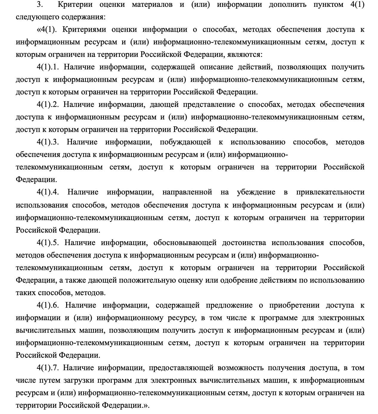 Запрещенной информацией об обходе блокировок Роскомнадзор считает «описывающую действия, позволяющие получить доступ», «дающую представление о способах, методах обеспечения доступа», «побуждающую к использованию способов, методов обеспечения доступа», «направленную на убеждение в привлекательности» или «обосновывающую достоинства способов, методов обеспечения доступа», а также «содержащую предложение о приобретении доступа» к заблокированным в России сервисам и сайтам.