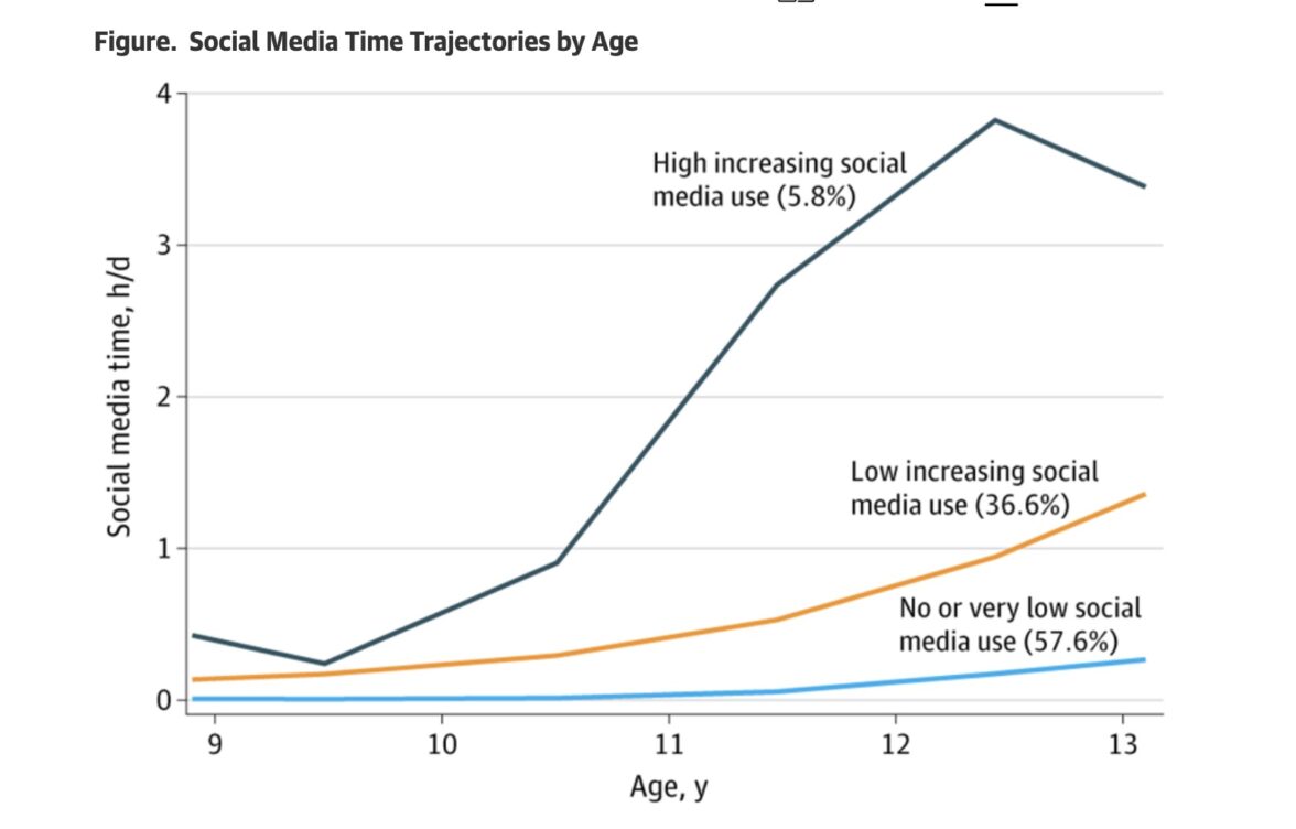 Как с возрастом менялось время, проводимое детьми в соцсетях. По горизонтали — возраст, по вертикали — время, проводимое в соцсетях (часов в день). Три линии соответствуют трем группам детей в зависимости от паттернов их поведения, в скобках указано, какой процент подростков попадает в данную группу. Верхняя линия — сильное увеличение времени, которое ребенок проводит в соцсетях, с возрастом. Средняя линия — незначительное увеличение времени, которое ребенок проводит в соцсетях, с возрастом. Нижняя линия — ребенок не пользуется или редко пользуется соцсетями.
