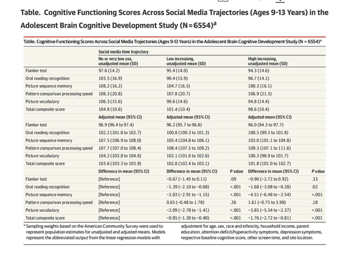 Множественный линейный регрессионный анализ позволил оценить связь между траекториями использования социальных сетей и когнитивными показателями два года спустя. Модели были скорректированы с учетом таких переменных как возраст, пол, раса, этническая принадлежность, доход домохозяйства, образование родителей, симптомы дефицита внимания/гиперактивности, симптомы депрессии, соответствующие исходные когнитивные показатели, время использования цифровых устройств без учета соцсетей, место проведения исследования. Результаты были взвешены для приближения к данным переписи населения США.