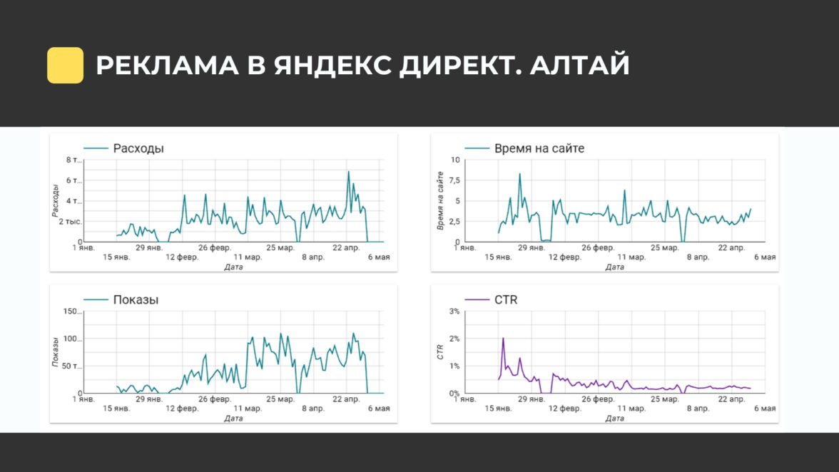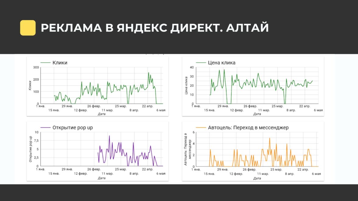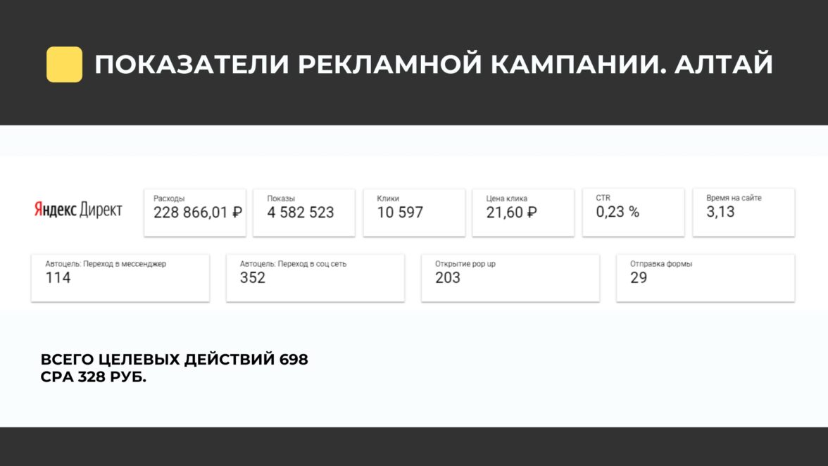 Рекламные кампании, проведенные с целью привлечения трафика на сайт, были осуществлены как по региону Алтай, так и по региону Кавказ. Целью кампаний было привлечение пользователей с последующим переходом на сайт и выполнением заранее определенных действий, таких как переход в мессенджер или социальную сеть, открытие pop-up окна и отправка формы.