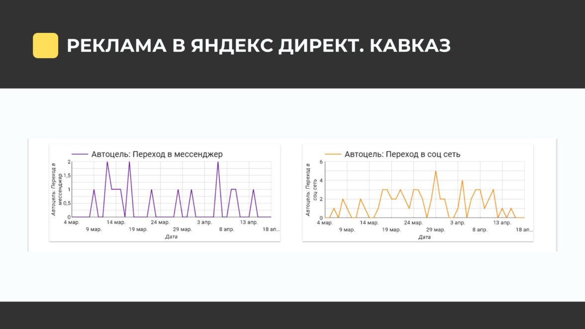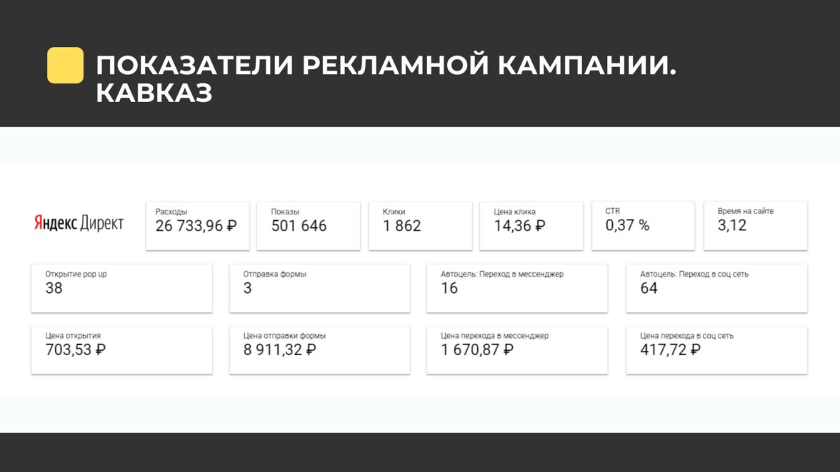 По результатам проведенных кампаний видно, что рекламная кампания в регионе Кавказ показала худшие результаты по сравнению с регионом Алтай. Несмотря на сопоставимое количество показов и кликов, стоимость клика оказалась выше, а конверсия в мессенджер и социальные сети была менее эффективной.